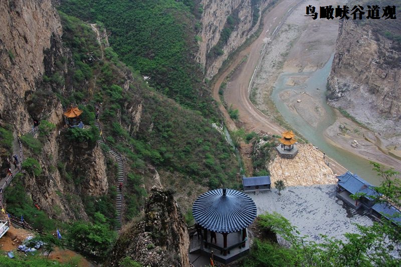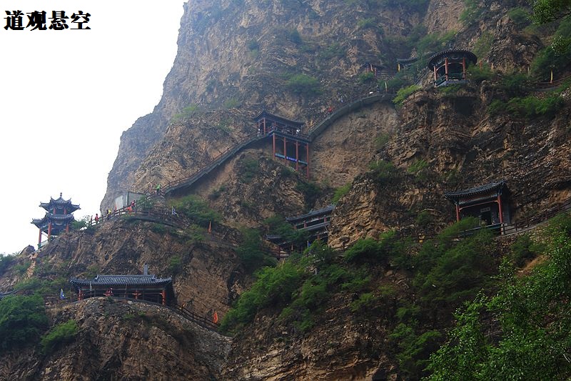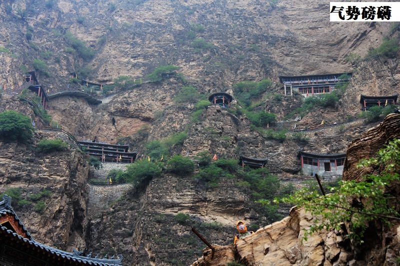 山路崎岖波折,路途尖石倒立,三个多小时的历程终于回到旅店。早上5点半起床“寻宝”活动在上午9时许正式结束,看着大家满满的收获,与其说是“寻宝”,不如说是“寻真”。在即将离开旅店去往“董存瑞纪念馆”之前,我们游览了“桑干河大峡谷”的石窟寺庙“像光洞”。相传其建于北魏年间,唐朝开国元勋在此得到成仙,一进入大峡谷的不远处,就会看到了一座在山崖峭壁上依山就石凿筑而成的石窟寺庙(28座),这些寺庙全部镶嵌在桑干河东岸的500多米高的崖壁上,与山西悬空寺齐名天下,而这些石窟寺庙的总称为“像光洞”。“悬崖道观”在悬崖峭壁之上三层布局,形态各异的宫殿可与悬空寺媲美!“悬崖道观”曾供奉魏征金身几百年。据有关资料介绍,最高处的建筑,距河谷底部河道有400余米,入口处伟岸的“太上老君”雕像为寺庙增色不少,陡峭的山壁像巨人的环臂让人敬而生畏,半山腰上的悬空扶梯让人紧贴山体而上,着实胆颤心惊……,但北粉的年轻小伙子们凭借着一腔热血努力冲在最前面,年长的领导们却无力攀爬如此陡峭岩壁,却看着冲劲十足的年轻背影欣慰的感慨:“后生可畏……!!!”片刻间满山的钟声和嘹亮青春的呐喊声向我们展示他们的胜利呼悦。